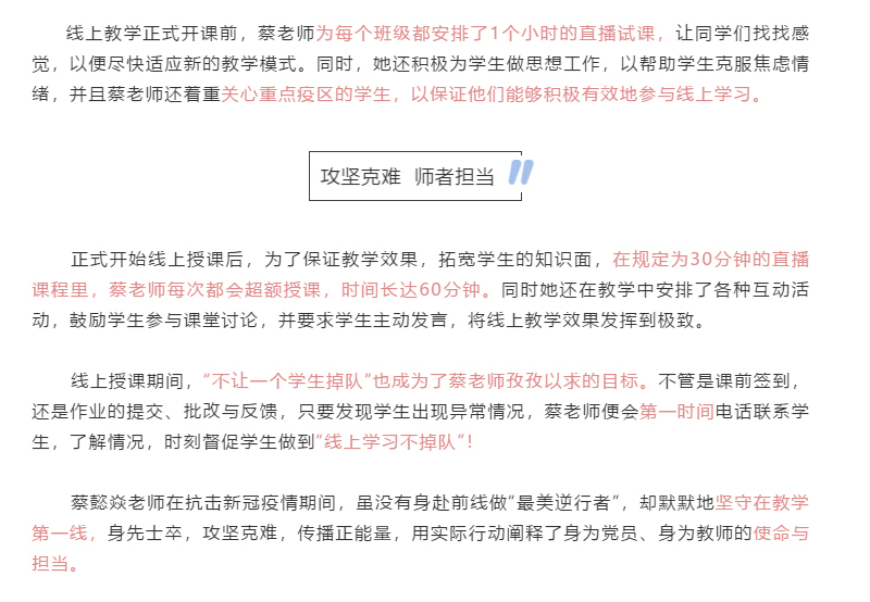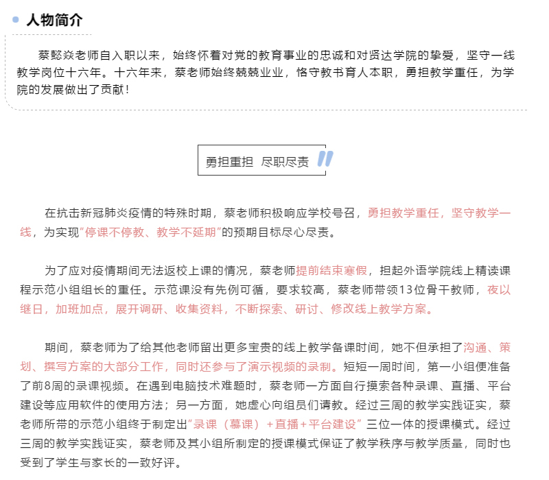 抗疫教学担重任 爱岗敬业做楷模——上海外国语大学贤达外语学院英语系蔡懿焱老师先进事迹