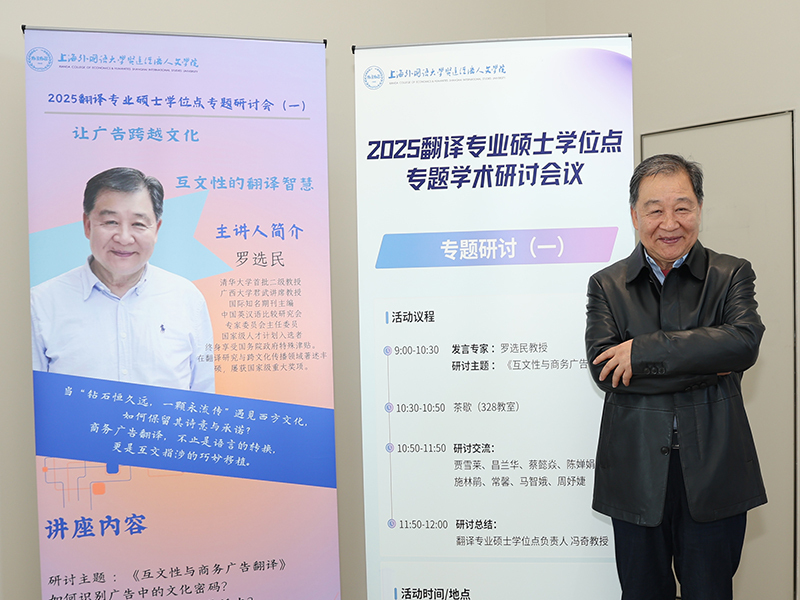 上午专题研讨由清华大学罗选民教授主讲,主题为《互文性与商务广告翻译》。罗教授系统阐释了互文性理论,并结合丰富案例,解析商务广告翻译中创意表达与文化传递的策略。他强调广告翻译应注重目的明确、语体得当、语言简洁及文本兼容,并与现场教师就文化差异、消费者心理等话题进行了互动交流。